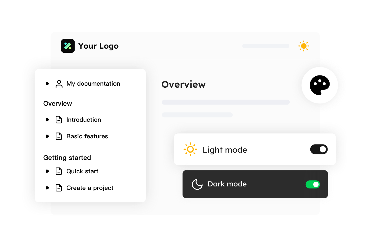 Elevate brand identity on your docs website by setting your logo & brand colors. You can also configure the site navigation, footer and docs sidebar to make your website more personalized.