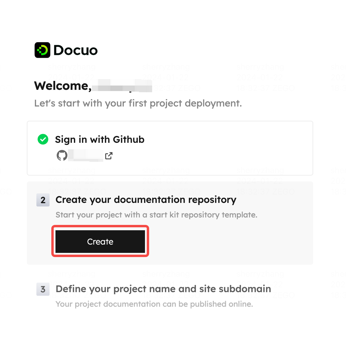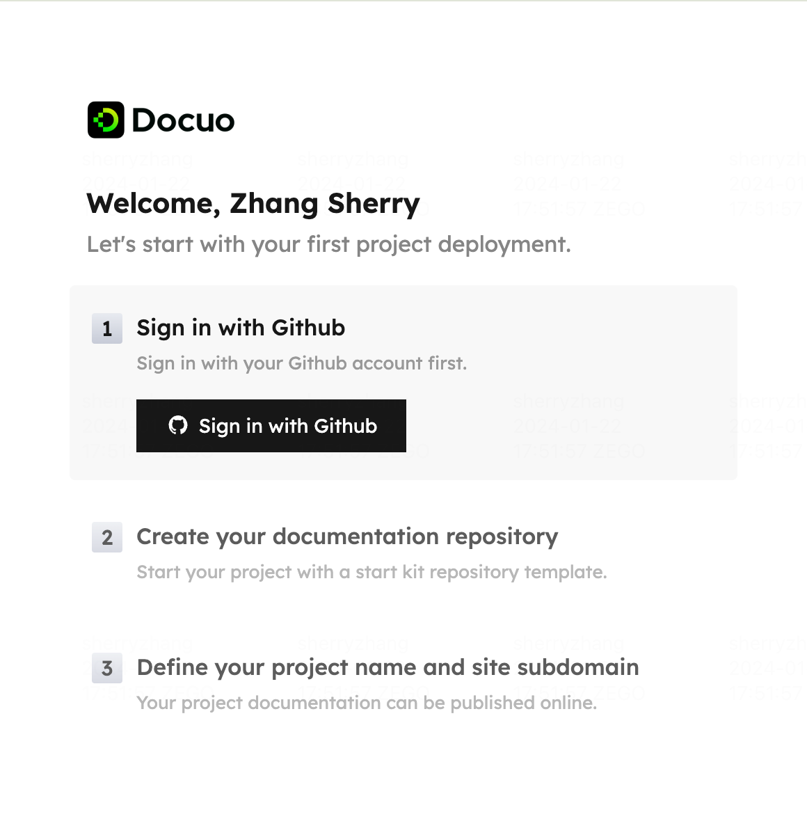 - Authorize Github We use Github as your docs repository source. All your docs will be stored and managed on your Github.